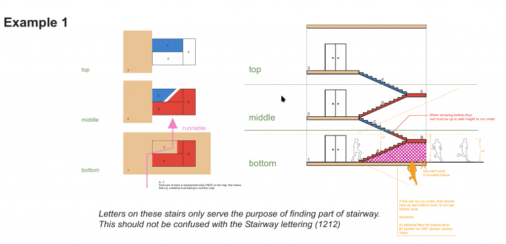 Присутнє однозначне пояснення, як обходитися із сходами, в тому числі і з такими складними випадками, як сходи з майданчиком між поверхом та гвинтові сходи. До речі, сходи тепер пропонується позначати коричневим кольором, а не чорним, як у спринті. Це пояснюється тим, що горизонталі (як ми їх знаємо по картам місцевості) більше не мають такого значення, але коричневий колір і далі позначає зміну висоти.